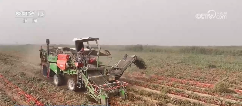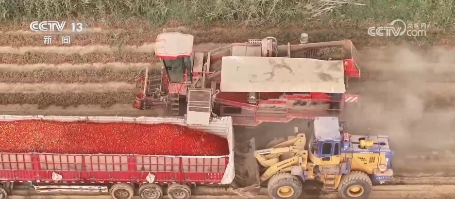 这两天,新疆昆玉市首次在沙漠边缘种植的上千亩制酱用的加工番茄迎来丰收,今年,当地运用番茄果实采收机、番茄装运采收机,提高采摘分拣效率。